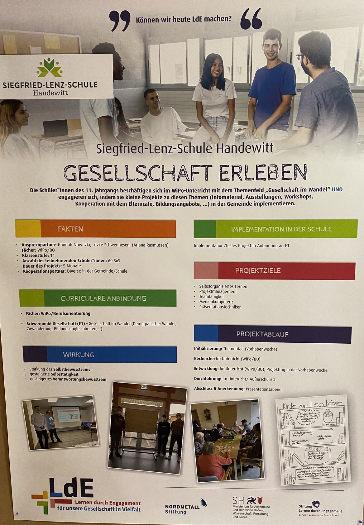 Am 27.04.2023 fand die Zertifizierungsfeier unserer Schule als LdE-Schule statt. Frau Schwennesen, Frau Rasmussen und Frau Nowitzki stellten einen Ausschnitt der tollen Projekte des 11. Jahrgangs 2022/23 vor, welche vom Publikum mit viel Applaus gewürdigt wurden. Wir freuen uns auf die Projekte des neuen 11. Jahrgang 2023/24, welche wir euch hier an dieser Stelle vorstellen werden.