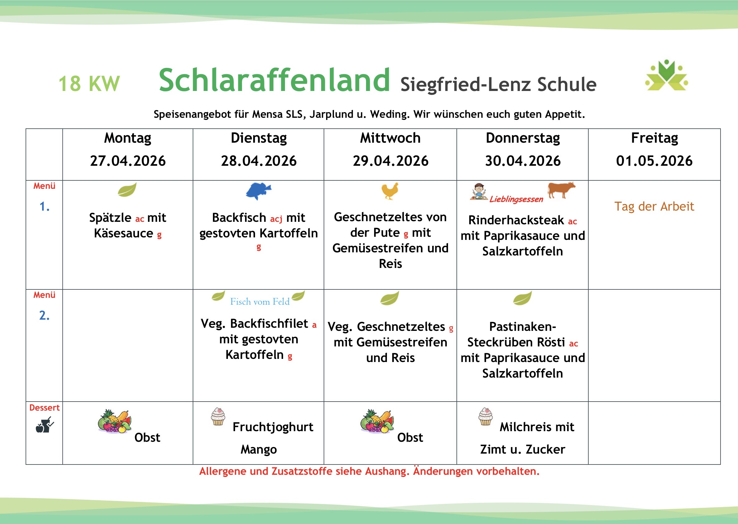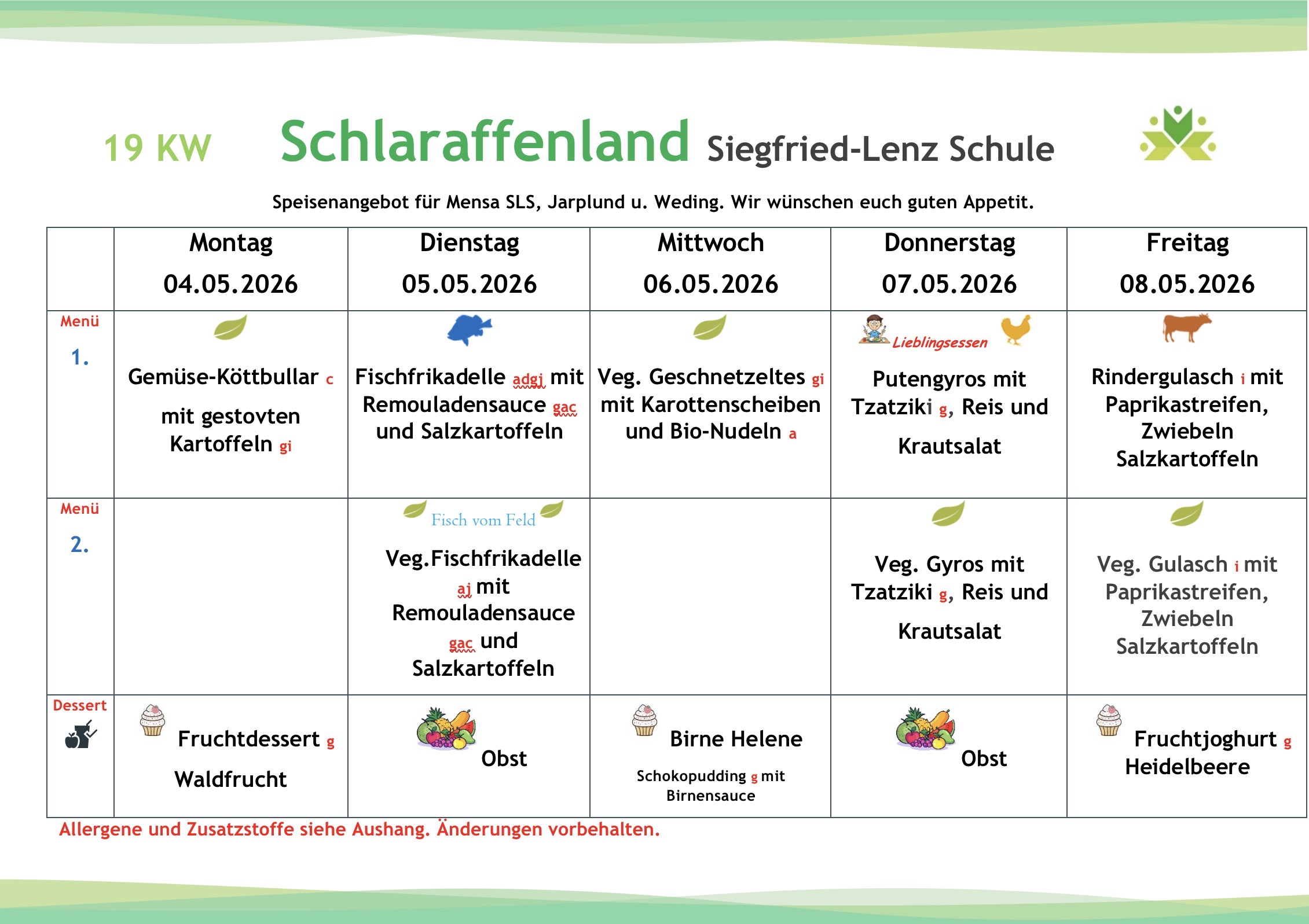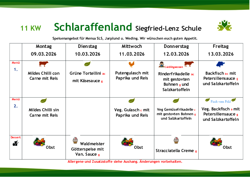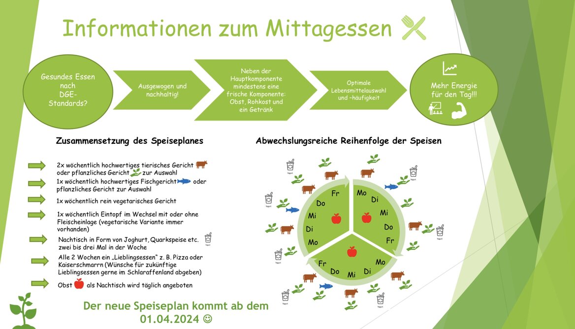 Die Gerichte werden zukünftig variabel auf die Wochentage verteilt, so dass beispielsweise der Fischtag nicht wie aktuell immer donnerstags, sondern auch an einem anderen Tag stattfinden wird. Jede zweite Woche wird an einem Tag ein sogenanntes „Lieblingsessen“ zubereitet (die Essenswünsche der Kinder und Jugendlichen werden berücksichtigt).