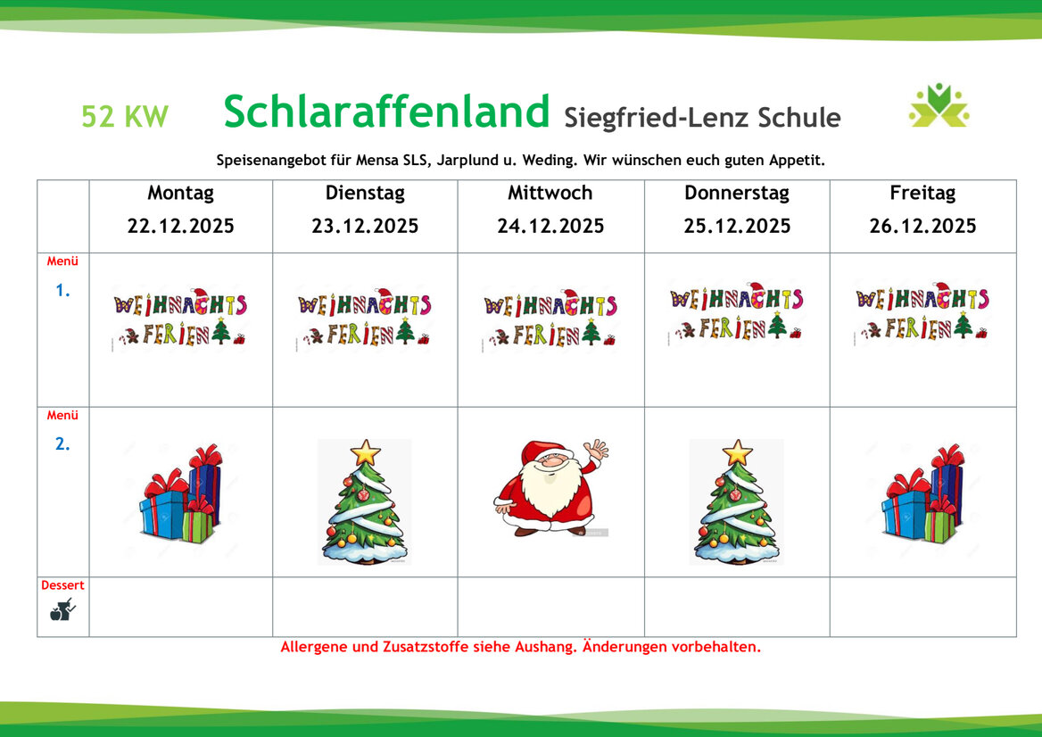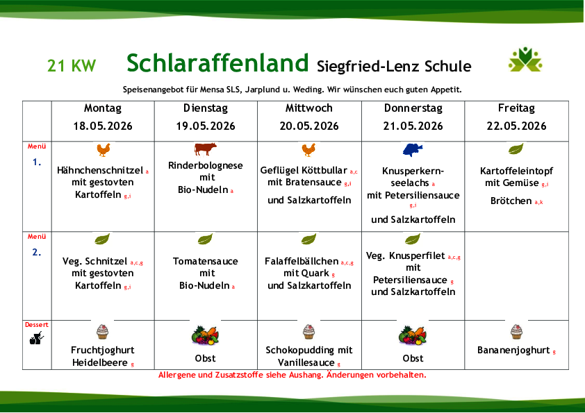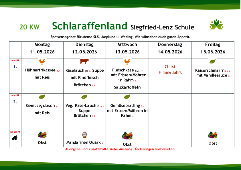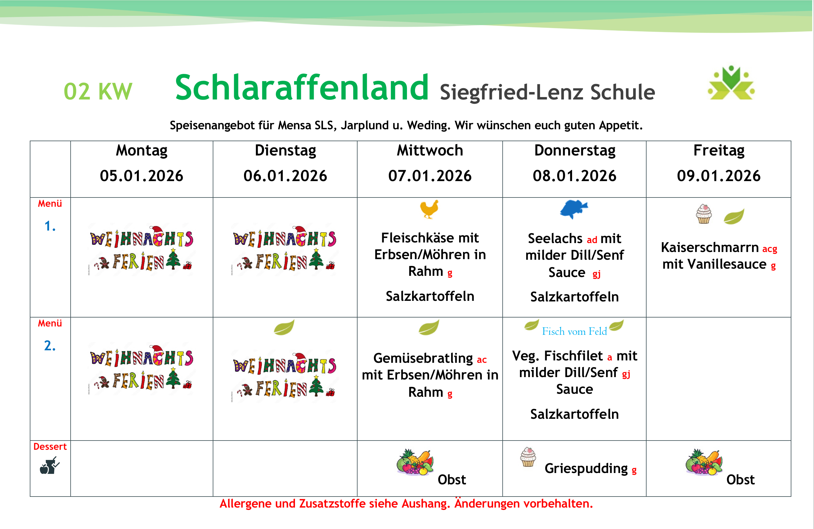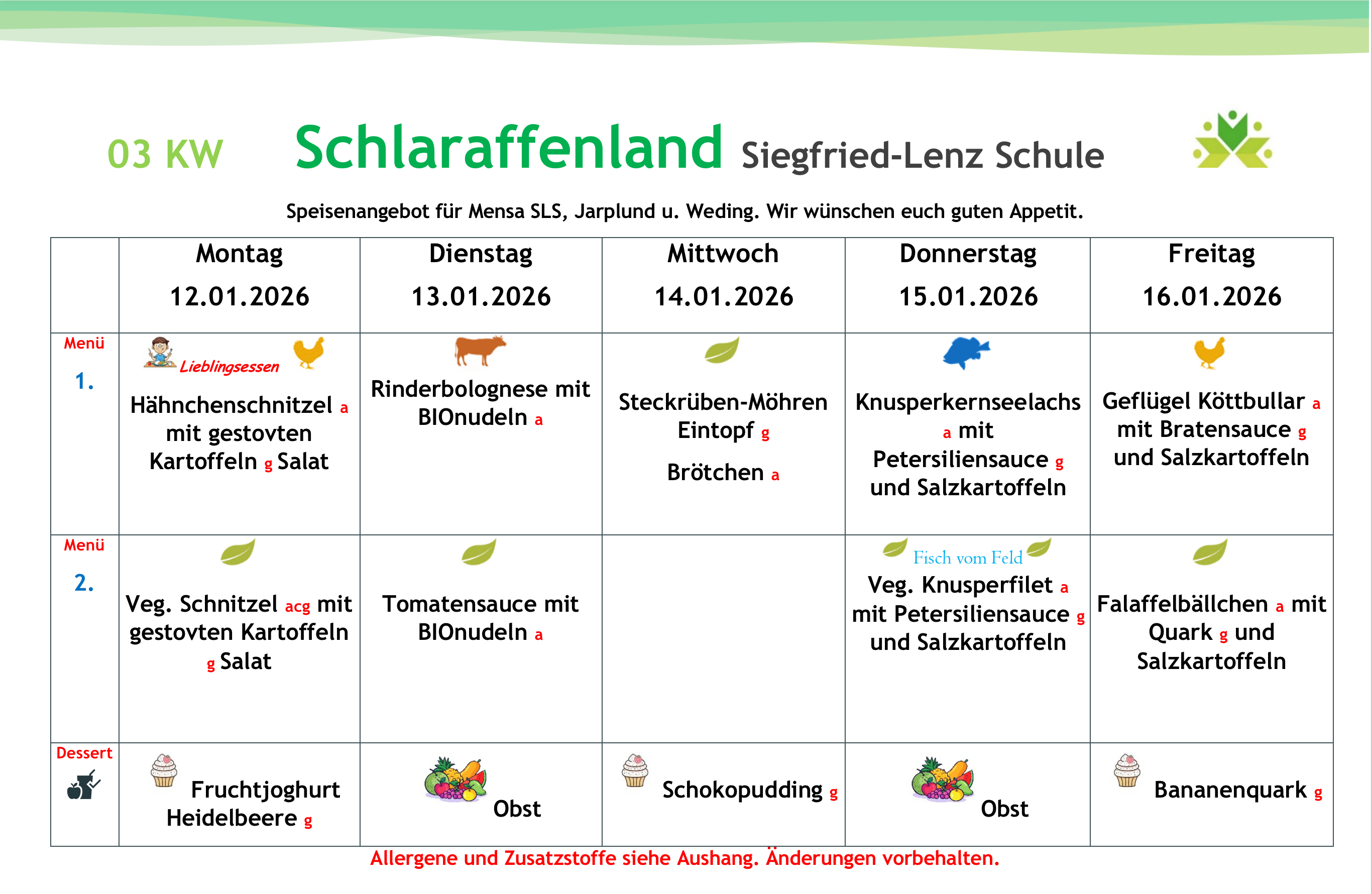 Die Gerichte werden zukünftig variabel auf die Wochentage verteilt, so dass beispielsweise der Fischtag nicht wie aktuell immer donnerstags, sondern auch an einem anderen Tag stattfinden wird. Jede zweite Woche wird an einem Tag ein sogenanntes „Lieblingsessen“ zubereitet (die Essenswünsche der Kinder und Jugendlichen werden berücksichtigt).