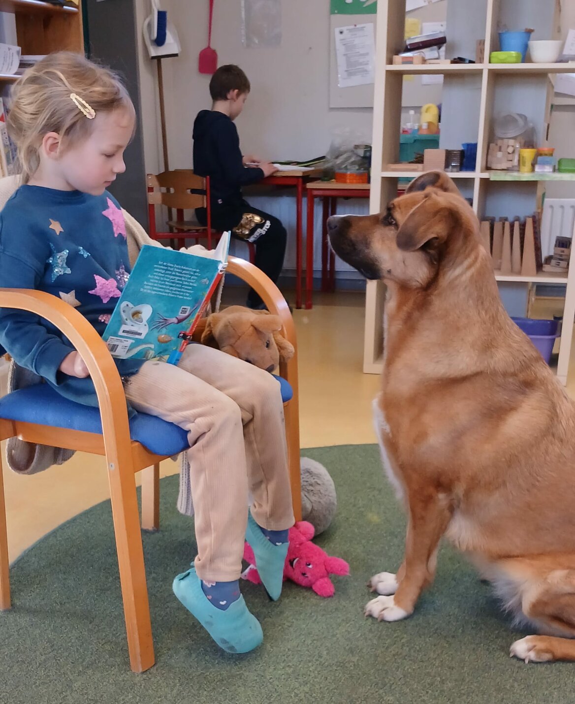 Seit 2021 arbeitet nun unsere sanfte „Frieda“ als feste Kollegin mit im Team Jarplund. Frieda nimmt ihre Aufgaben sehr ernst. Sie ist im Umgang mit den Kindern ausgesprochen hingebungs- und liebevoll. Sie ist wie auch ihre Vorgängerinnen eine ausgebildete und zertifizierte Therapiebegleithündin und Frau Joost geprüfte Therapiehundeführerin.