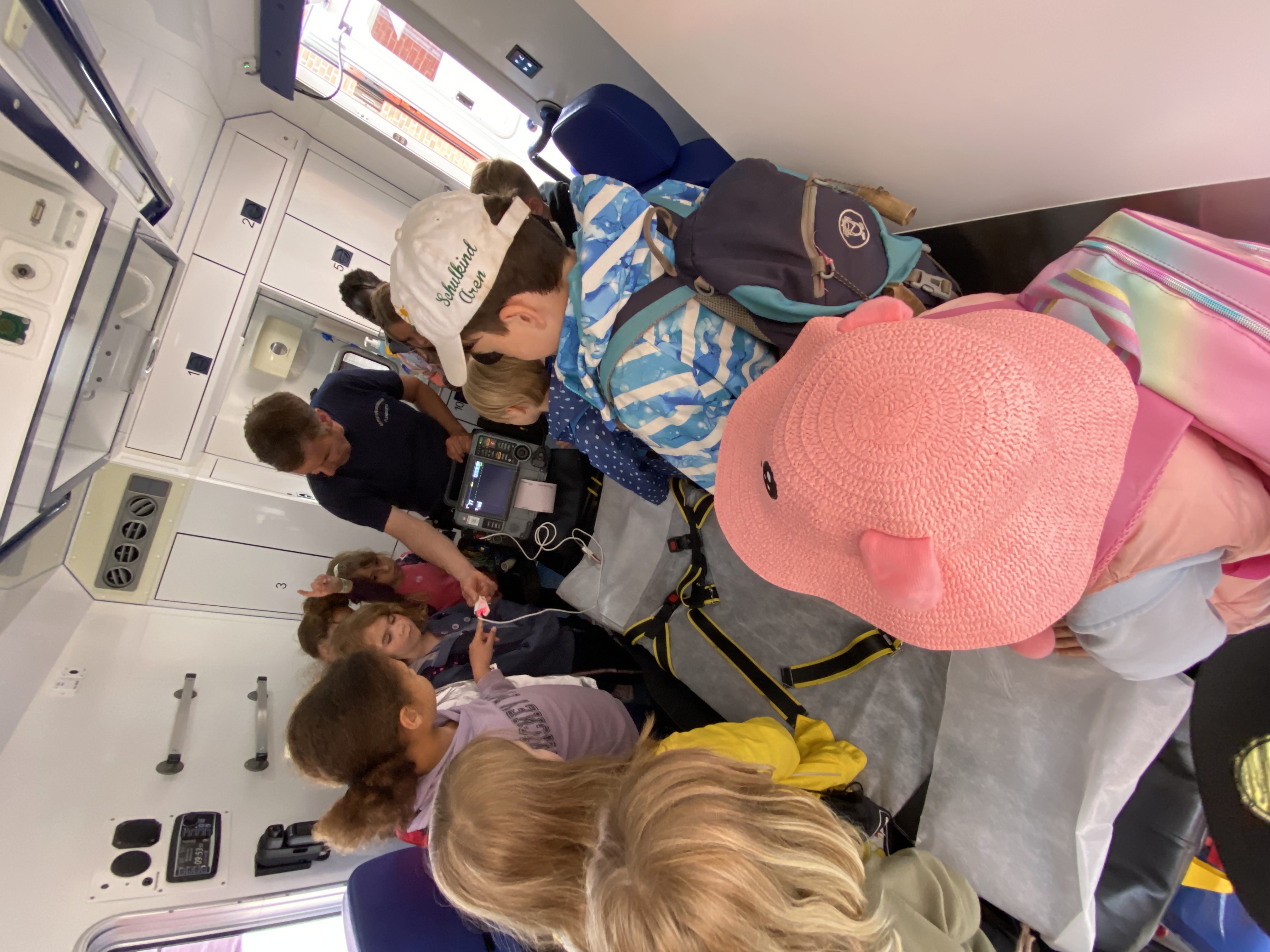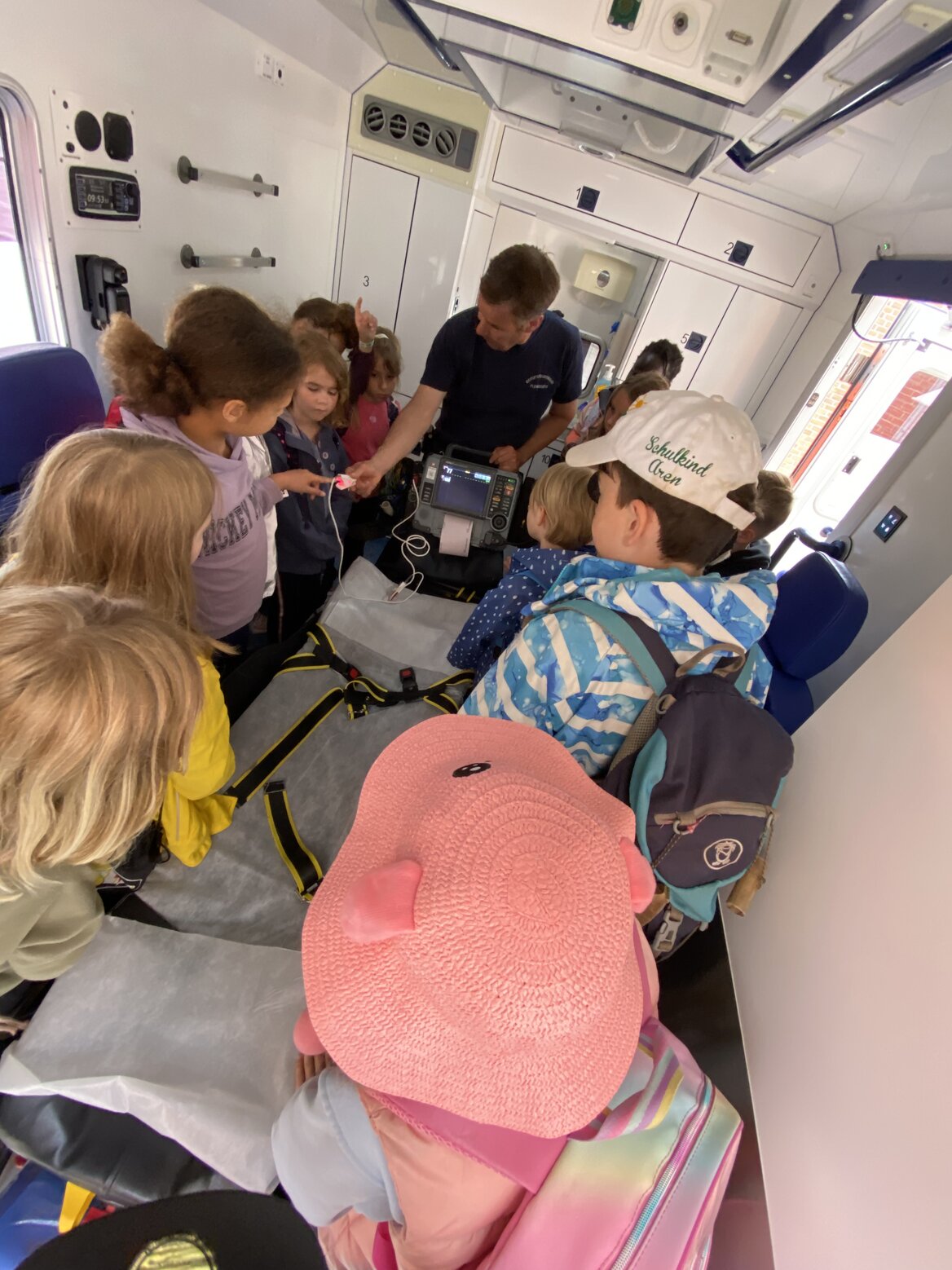 Vom Anziehen der Feuerwehrkluft über das Ausprobieren des Schnelllöschschlauches, dem Ertönen des Martinshorns bis zum Hineinklettern in das Fahrzeug selbst, war alles aufregend und spannend. Zudem durften die Zweitklässler einen RTW inspizieren, bekamen einen Einblick in die Aufgaben des Rettungspersonals, erhielten Verhaltensmaßgaben bei einem Feuernotfall und vor allem wurde den Kindern erklärt, wie ein Einsatz abläuft- die Helfer sind Retter, vor denen man keine Angst haben soll - selbst, wenn diese in Atemschutzgerät auftauchen.